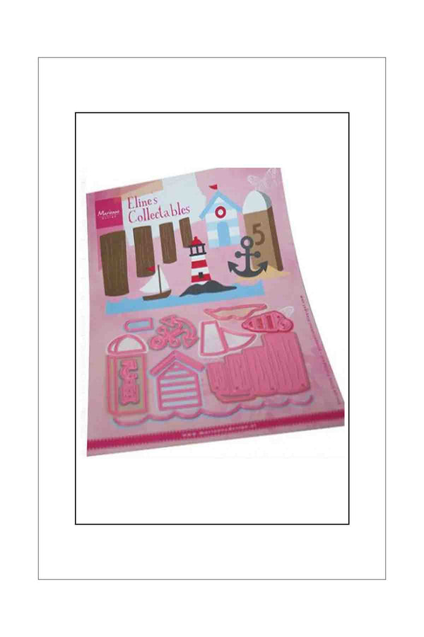 Sea waves, boat, anchor, lighthouse on a rock, pier pylons/beach wall, beach hut, marker bollard