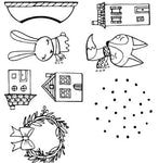 Includes globe, bunny, fox, houses, Christmas wreath.
