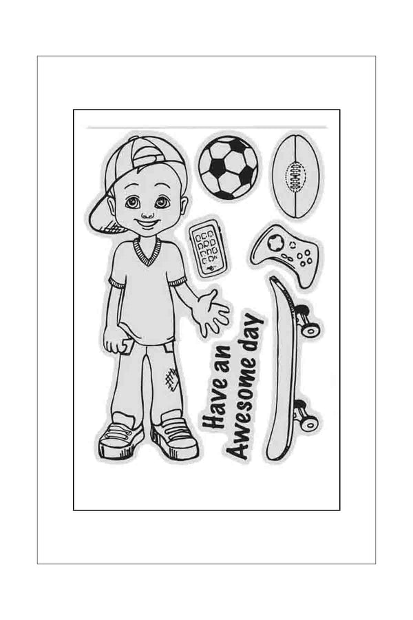 Boy with soccer ball, football, mobile, game controller, skateboard.