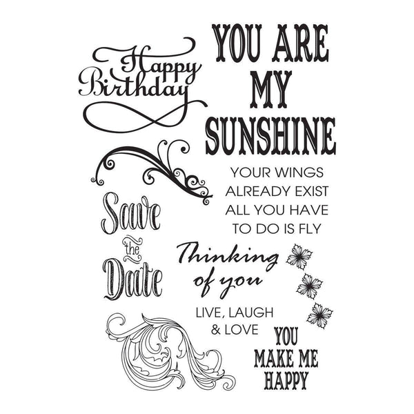 Send your messages through these lovely words and stamped images including flower border and flourishes.